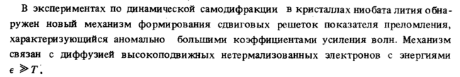 В экспериментах по динамической самодифракции в кристаллах киобата лития обнаружен новый механизм формирования сдвиговых решеток показателя преломления, характеризующийся аномально большими коэффициентами усиления волн. Механизм связан с диффузией высокоподвижных нетермализованных электронов с энергиями