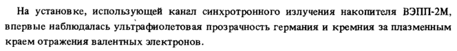 На установке, использующей канал синхротронного излучения накопителя ВЭПП-2М, впервые наблюдалась ультрафиолетовая прозрачность германия и кремния за плазменным краем отражения валентных электронов.