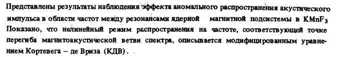 Представлены результаты наблюдения эффекта аномального распространения акустического импульса в области частот между резонансами ядерной магнитной подсистемы в KMnF3 Показано, что нелинейный режим распространения на частоте, соответствующей точке перегиба магнитоакустической ветви спектра, описывается модифицированным уравнением Кортевега де В риза (КДВ).