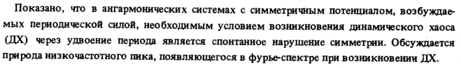 Показано, что в ангармонических системах с симметричным потенциалом, возбуждаемых периодической силой, необходимым условием возникновения динамического хаоса (ДХ) через удвоение периода является спонтанное нарушение симметрии. Обсуждается природа низкочастотного пика, появляющегося в фурье-спектре при возникновении ДХ.