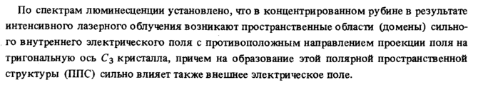 По спектрам люминесценции установлено, что в концентрированном рубине в результате интенсивного лазерного облучения возникают пространственные области (домены) сильного внутреннего электрического поля с противоположным направлением проекции поля на тригональную ось Сз кристалла, причем на образование этой полярной пространственной структуры (ППС) сильно влияет также внешнее электрическое поле.