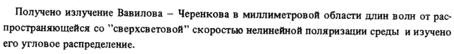 Получено излучение Вавилова Черенкова в миллиметровой области длин волн от распространяющейся со "сверхсветовой" скоростью нелинейной поляризации среды и изучено его угловое распределение.