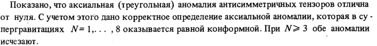 Показано, что аксиальная (треугольная) аномалия антисимметричных тензоров отлична от нуля. С учетом этого дано корректное определение аксиальной аномалии, которая в су -пергравитациях N= 1,.. . ,8 оказывается равной конформной. При N> 3 обе аномалии исчезают.