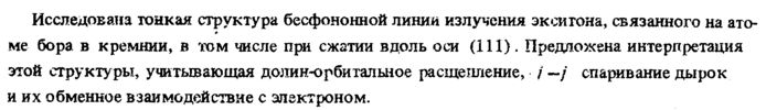 Исследована тонкая структура бесфононной линии излучения экситона, связанного на атоме бора, в кремнии, в том числе при сжатии вдоль оси (111). Предложена интерпретация этой структу ры, учитывающая дояин-орбитальное расщепление, / —/ спаривание дырок и их обменное взаимодействие с электроном.