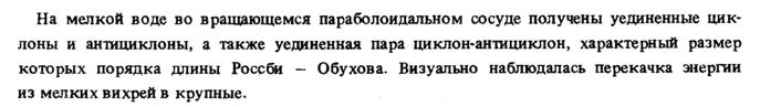 На мелкой воде во вращающемся параболоидальном сосуде получены уединенные циклоны и антициклоны, а также уединенная пара циклон-антициклон, характерный размер которых порядка длины Россби Обухова. Визуально наблюдалась перекачка энергии из мелких вихрей в крупные.