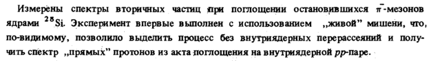 Измерены спектры вторичных частиц яри поглощении остановившихся π-мезонов ядрами Si. Эксперимент впервые выполнен с использованием „живой" мишени, что, по-видимому, позволило выделить процесс без внутриядерных пере рассеяний и получить спектр „прямых" протонов из акта поглощения на внутриядерной рр-шре.