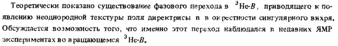 "3 Теоретически показано существование фазового перехода в Ие-В, приводящего к появлению неоднородной текстуры поля директрисы η в окрестности сингулярного вихря, Обсуждается возможность того, что именно этот переход наблюдался в недавних ЯМР экспериментах в о в ращающемся 3 Не-5»