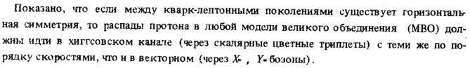Показано, что если между кварк-лепта иными поколениями существует горизонтальная симметрия, то распады протона в любой модели великого объединения (МВО) должны идти в хиггсовском канале (через скалярные цветные триплеты) с теми же по порядку скоростями, что и в векторном (через X* , Убозоны).