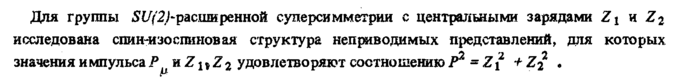 Для группы SU(^-расширенной суперсимметрии с центральными зарядами Zj и Z2 исследована спин-изоспииовая структура неприводимых представлений, для которых значения импульса Ρ ηΖχ^Ζ^ удовлетворяют соотношению Ρ* =Ζ\ + Ζ£ ·