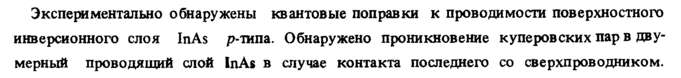 Эксперт ментально обнаружены квантовые поправки к проводимости поверхностного инверсионного слоя InAs р-типа. Обнаружено проникновение куперовских пар в двумерный проводящий слой InAs в случае контакта последнего со сверхпроводником.