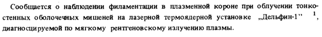 Сообщается о наблюдении филаментации в плазменной короне при облучении тонкостенных оболочечных мишеней на лазерной термоядерной установке ,,Дельфин-Г' 1, диагносцируемой по мягкому рентгеновскому излучению плазмы.