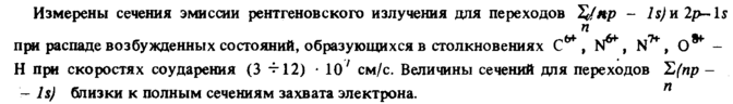 Измерены сечения эмиссии рентгеновского излучения для переходов Is) и 2p-ls η при распаде возбужденных состояний, образующихся в столкновениях С6* , Ν** , Ν7* , О*" -Η при скоростях соударения (3 "М2) * 10' см/с. Величины сечений для переходов Ъ(пр -Is) близки к полным сечениям захвата электрона. п