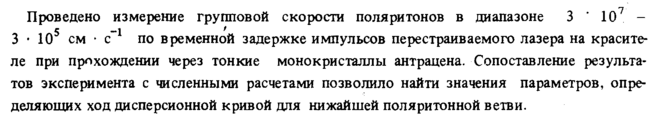 Проведено измерение групповой скорости поляритонов в диапазоне 3 ' 10 - 5 -1 ' 3*10 см с по временной задержке импульсов перестраиваемого лазера на красителе при прохождении через тонкие монокристаллы антрацена. Сопоставление результатов эксперимента с численными расчетами позволило найти значения параметров, определяющих ход дисперсионной кривой для нижайшей поляритонной ветви.