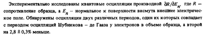 Экспериментально исследованы квантовые осцилляции производной ЬЯ/ЬЕ^, где R — сопротивление образца, а Еп нормальное к поверхности висмута внешнее электрическое поле. Обнаружены осцилляции двух различных периодов, один их которых совпадает с периодом осцилляции Шубникова де Гааза у электронов в объеме образца, а второй на 2,8 ± 0,3% меньше.