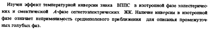 Изучен эффект температурной инверсии знака ВППС в изотропной фазе холестеричео ких и смектической Л-фазе сегнето электрических ЖК. Наличие инверсии в изотропной фазе означает неприменимость среднеполевого приближения для описания промежуточных голубых фаз.