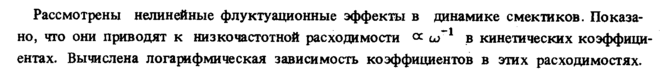 Рассмотрены нелинейные флуктуационные эффекты в динамике смектиков. Показано, что они приводят к низкочастотной расходимости <χ ω*1 в кинетических коэффициентах. Вычислена логарифмическая зависимость коэффициентов в этих расходимостях.