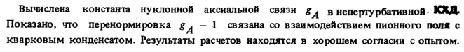 Вычислена константа нуклонной аксиальной связи ^ в непертурбативнойЮЩ. Показано, что перенормировка — 1 связана со взаимодействием пи он но го поля с кварковым конденсатом. Результаты расчетов находятся в хорошем согласии с опытом.
