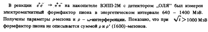 В реакции её -> π π на накопителе ВЭПП-2М с детектором „ОЛЯ" был измерен электромагнитный формфактор пиона в энергетическом интервале 640 1400 МэВ. Получены параметры р-мезона и ρ (^интерференции. Показано, что при V? > 1000 МэВ формфактор пиона не описьшается суммой ρ и р' (1600)-мезонов.