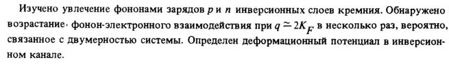 Изучено увлечение фононами зарядов рил инверсионных слоев кремния. Обнаружено возрастание, фононэлектронно го взаимодействия при q — 2Кр в несколько раз, вероятно, связанное с дв у мерностью системы. Определен деформационный потенциал в инверсионном канале.