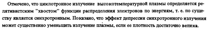 Отмечено, что циклотронное излучение высокотемпературной плазмы определяется релятивистским "хвостом" функции распределения электронов по энергиям, т. е. по существу является синхротронным. Показано, что эффект депрессии синхротронного излучения может существенно уменьшить излучение плазмы, если ее плотность достаточно велика.