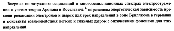 Впервые по затуханию осцилляции в многоосцилляционных спектрах электроотражения с учетом теории Аронов а и Иоселевича определены энергетическая зависимость времени релаксации электронов и дырок для трех направлений в зоне Бриллюэна в германии и константы взаимодействия легких и тяжелых дырок с оптическими фононами для этих направлений.