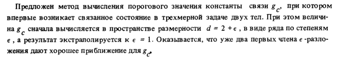 Предложен метод вычисления порогового значения константы связи g , при котором впервые возникает связанное состояние в трехмерной задаче двух тел. При этом величина g сначала вычисляется в пространстве размерности d = 2 +е , в виде ряда по степеням е , а результат экстраполируется к е 1. Оказывается, что уже два первых члена е -разложения дают хорошее приближение для g .