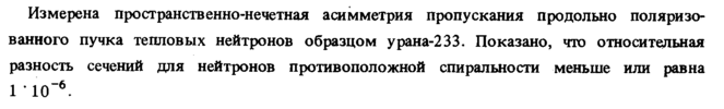 Измерена пространственно-нечетная асимметрия пропускания продольно поляризованного пучка тепловых нейтронов образцом урана-233. Показано, что относительная разность сечений для нейтронов противоположной спирально ста меньше или равна 1 " 10"*-