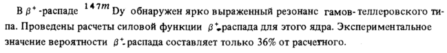 В β* -распаде Dy обнаружен ярко выраженный резонанс гамов-теллеровского типа. Проведены расчеты силовой функции 0 «распада для этого ядра. Экспериментальное значение вероятности /3+~ распада составляет только 36% от расчетного.