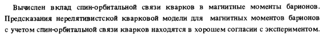 Вычислен вклад спин-орбитальной связи кварков в магнитные моменты барионов. Предсказания нерелятивистской кварковой модели для магнитных моментов барионов с учетом спин-орбитальной связи кварков находятся в хорошем согласии с экспериментом.