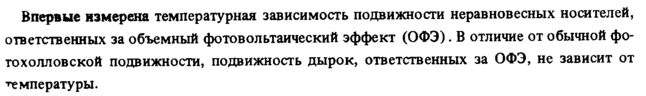 Впервые измерена температурная зависимость подвижности неравновесных носителей, ответственных за объемный фотовольтаический эффект (ОФЭ). В отличие от обычной фо-тохолловской подвижности, подвижность дырок, ответственных за ОФЭ, не зависит от температуры.