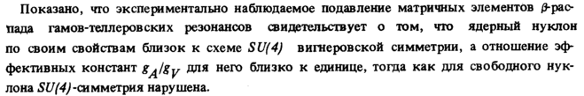 Показано, что эксперт ментально наблюдаемое подавление матричных элементов 0-распада гамов-теллеровских резонансов свидетельствует о том, что ядерный нуклон по своим свойствам близок к схеме SU(4) вигнеровской симметрии, а отношение эффективных констант g^/gy ДЛЯ него близко к единице, тогда как для свободного нуклона SU(4)-симметрия нарушена.