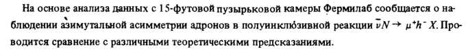На основе анализа данных с 15-футовой пузырьковой камеры Фермилаб сообщается о на-блюдении азимутальной асимметрии адронов в полуинклюзивной реакции νΝ~* μ+Λ"Χ Проводится сравнение с различными теоретическими предсказаниями.