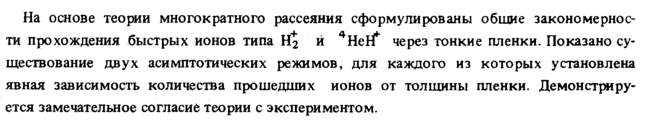 На основе теории многократного рассеяния сформулированы общие закономерности прохождения быстрых ионов типа Н2 й 4Heli через тонкие пленки. Показано существование двух асимптотических режимов, для каждого из которых установлена явная зависимость количества прошедших ионов от толщины пленки. Демонстрируется замечательное согласие теории с экспериментом.