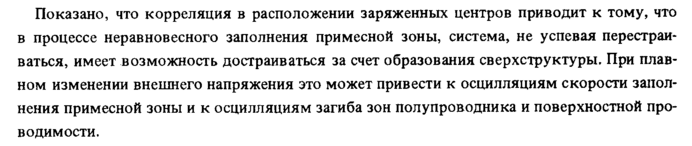 Показано, что корреляция в расположении заряженных центров приводит к тому, что в процессе неравновесного заполнения примесной зоны, система, не успевая перестраиваться, имеет возможность достраиваться за счет образования сверхструктуры. При плавном изменении внешнего напряжения это может привести к осцилляциям скорости заполнения примесной зоны и к осцилляциям загиба зон полупроводника и поверхностной проводимости.