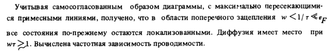 Учитывая самосогласованным образом диаграммы, с максимально пересекающимися примесными линиями, получено, что в области поперечного зацепления w <1/тКе^ все состояния по-прежнему остаются локализованными. Диффузия имеет место при wt >Д. Вычислена частотная зависимость проводимости.
