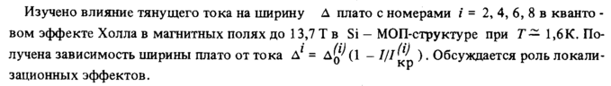 Изучено влияние тянущего тока на ширину Δ плато с номерами г = 2, 4, 6, 8 в кванто -вом эффекте Холла в магнитных полях до 13,7 Τ в Si МОП-структуре при Т— 1,6К. Получена зависимость ширины плато от тока Δ* = А$ (1 ) · Обсуждается роль локали-зационных эффектов.