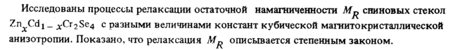 Исследованы процессы релаксации остаточной намагниченности сниновых стекол Zn^Cdj _ xCr2Se4 с разными величинами констант кубической магнитокристаллической анизотропии. Показано, что релаксация Μр описывается степенным законом.