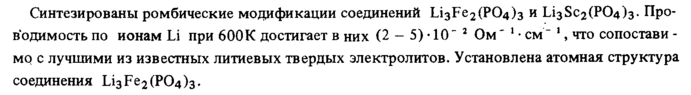 Синтезированы ромбические модификации соединений 1лзРе2(Р04)з и Li3Sc2(P04)3. Проводимость по ионам Li при 600К достигает в них (2 5)· 10" 2 Ом" 1 ♦ см" 1, что сопостави -мо с лучшими из известных литиевых твердых электролитов. Установлена атомная структура соединения Li3Fe2(P04)3.