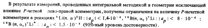 В результате измерений, проведенных интегральной методикой в геометрии исключающей влияние Учетной лево-правой асимметрии, получены ограничения на величину Р-нечетной асимметриив реакциях 6Щп, а )3Н :\ар\< 1,4*10~б, 10B(«, aQ )7Li :\ар\< 8· 10"6 ; 1 °В (п, ах )7Li* : | ап \ < 1,5 10" 6 (90%-ный уровень достоверности).
