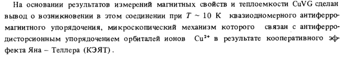 На основании результатов измерений магнитных свойств и теплоемкости CuVG сделан вывод о возникновении в этом соединении при Τ ~ 10 К квазиодномерного антиферромагнитного упорядочения, микроскопический механизм которого связан с антиферро-дисторсионным упорядочением орбиталей ионов Си2+ в результате кооперативного эффекта Яна Теллера (КЭЯТ).