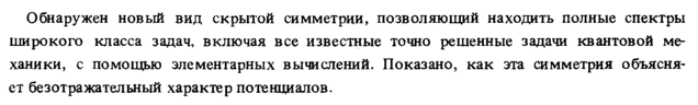 Обнаружен новый вид скрытой симметрии, позволяющий находить полные спектры широкого класса задач, включая все известные точно решенные задачи квантовой механики, с помощью элементарных вычислений. Показано, как эта симметрия объясняет безотражательный характер потенциалов.