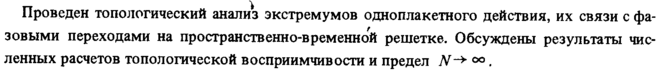 Проведен топологический анализ экстремумов одноплакетного действия, их связи с фазовыми переходами на пр остр анственн о-в ременной решетке. Обсуждены результаты численных расчетов топологической восприимчивости и предел N~> 00.