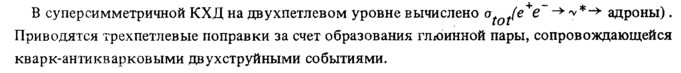В суперсимметричной КХД на двухпетлевом уровне вычислено af0t(e+e~ 'ν*"~>' адроны). Приводятся трехпетлевые поправки за счет образования глюинной пары, сопровождающейся кварк-антикварковыми двухструйными событиями.
