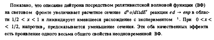 Показано, что описание дейтрона посредством релятивистской волновой функции (ВФ) на световом фронте увеличивает расчетное сечение d2 σ/dSldE' реакции ed -> епр в области 1/2 < χ < 1 и ликвидирует имевшееся расхождение с экспериментом 1. При 0 <х< < 1/2, напротив, предсказывается уменьшение сечения. Эти оба качественных эффекта есть проявление одного весьма общего свойства неодновременной ВФ.