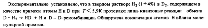 Экспериментально установлено, что в твердом растворе Н2 (1 в D2, содержащем в качестве примеси атомы Η и D при Г< 5,9К протекают лишь квантовые реакции обмена D + Н2 -> HD + Ни D Dрекомбинации. Обнаружена локализация атомов Η вблизи молекулярной примеси.