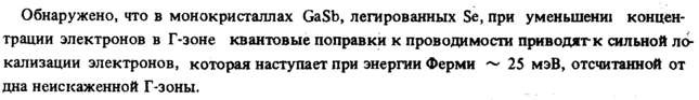 Обнаружено, что в монокристаллах GaSb, легированных Se, при уменьшенш концентрации электронов в Г-зоне квантовые поправки к проводимости приводят* к сильной локализации электронов, которая наступает при энергии Ферми ~~ 25 мэВ, отсчитанной от дна неискаженной Г-зоны.