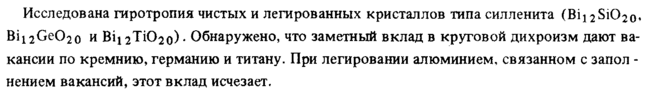 Исследована гиротропия чистых и легированных кристаллов типа силленита (Bi^SiO^o* Bi12GeO2 0 и Bii2Ti02o) · Обнаружено, что заметный вклад в круговой дихроизм дают вакансии по кремнию, германию и титану. При легировании алюминием, связанном с запол -нением вакансий, этот вклад исчезает.