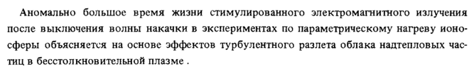 Аномально большое время жизни стимулированного электромагнитного излучения после выключения волны накачки в экспериментах по параметрическому нагреву ионосферы объясняется на основе эффектов турбулентного разлета облака надтепловых частиц в бесстолкновительной плазме.