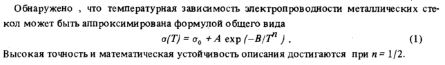 Обнаружено , что температурная зависимость электропроводности металлических стекол может быть аппроксимирована формулой общего вида а(Т) = а0+Аехр(-В/7" ) , (1) Высокая точность и математическая устойчивость описания достигаются при η = 1/2.