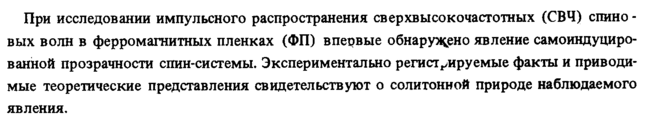 При исследовании импульсного распространения сверхвысокочастотных (СВЧ) спино -вых волн в ферромагнитных пленках (ФП) впервые обнаружено явление самоиндуцированной прозрачности спин-системы. Экспериментально регистрируемые факты и приводимые теоретические представления свидетельствуют о солитонной природе наблюдаемого явления.